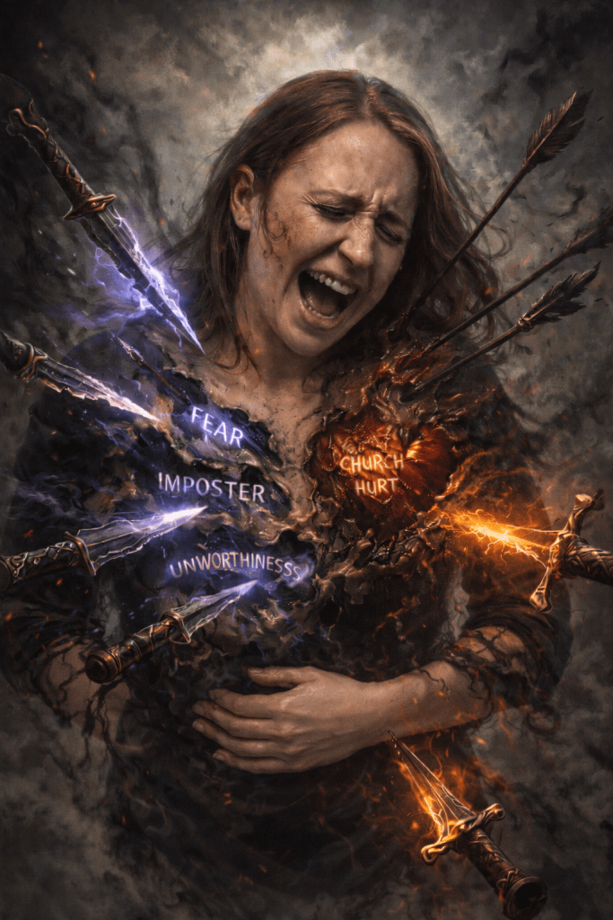 Supernatural knives stabbing at my unworthiness, tearing me open to expose the fear of being an imposter. Arrows ripping through the scars on my heart left from church hurt. Swords slashing at my physical health, causing nausea, anxiety and a fear that kept me up at night because what if I backslid again? I could not fail, and the anxiety over avoiding what felt like a certainty was like a poison spreading through me and weakening me, assigning me to certain defeat before I even began.